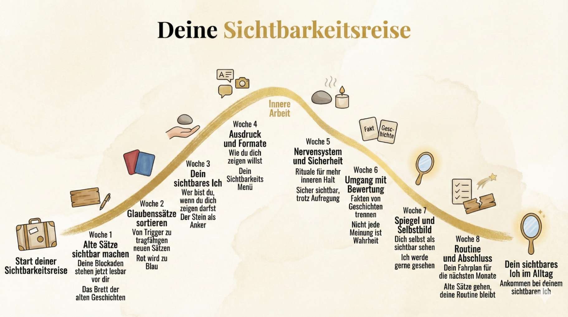 In diesen 8 Wochen tauchen wir gemeinsam tief ein – Schritt für Schritt, mit klarem Fahrplan und sanfter Begleitung.